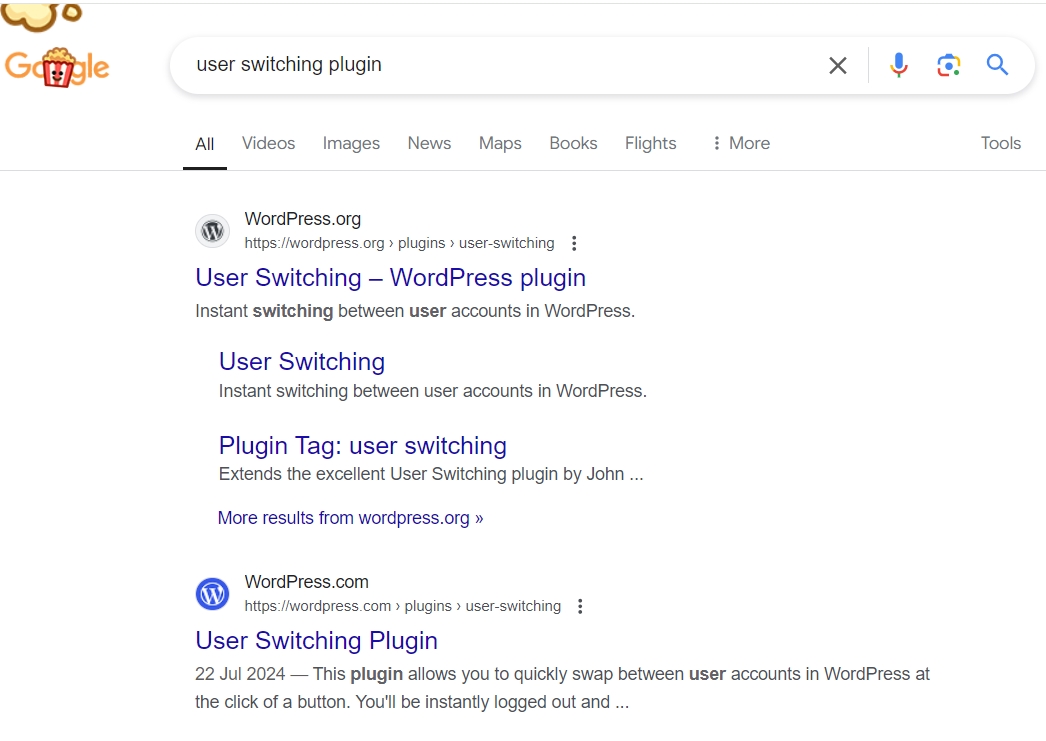 Wenn du beispielsweise nach einem WordPress-Plugin (eine Erweiterung zu WordPress) in Google oder anderen Suchmaschinen suchst, wirst du in der Regel zuoberst in den Suchresultaten gleich zwei Einträge mit «WordPress» erhalten. Unten ein Beispiel. Wir suchen ein Plugin, das es einem Admin ermöglicht, mit einem einfachen Klick zwischen Nutzerkonti zu wechseln. Das kann pratisch sein, um Einstellungen für gewisse Nutzergruppen auszutesten. Wenn wir «user switching plugin» eingeben, erhalten wir folgende Resultate ganz zuoberst: