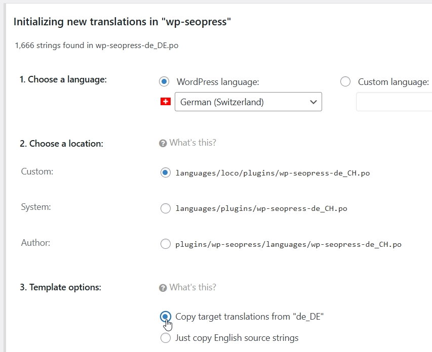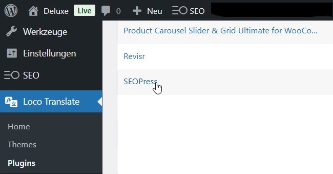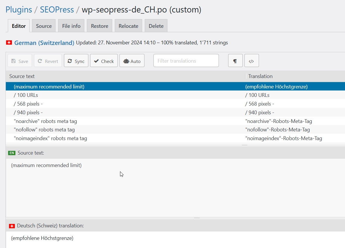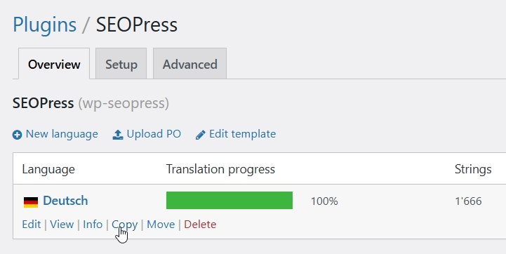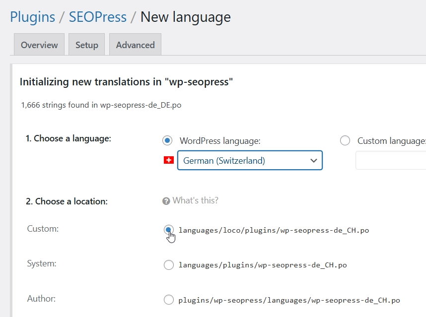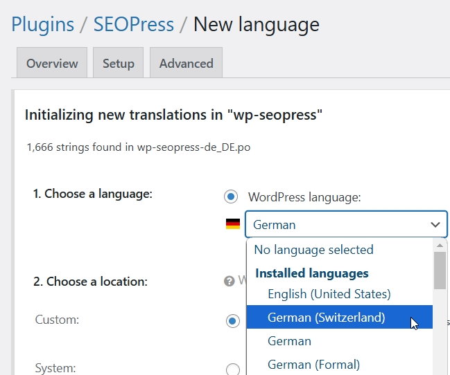 Bleiben wir beim Beispiel SEOPress: Wir wollen, dass alle Plugin-Strings im Backend, also auch im Dashboard, in der Website-Sprache Deutsch (Schweiz) angezeigt werden.