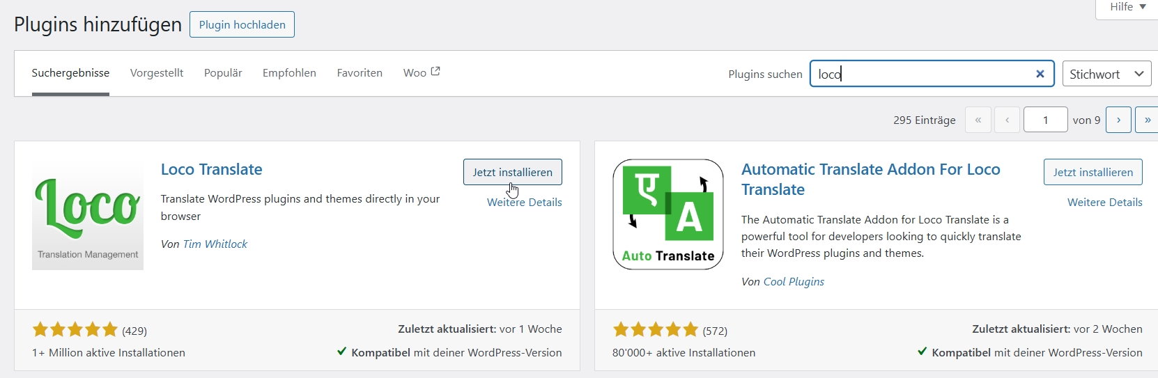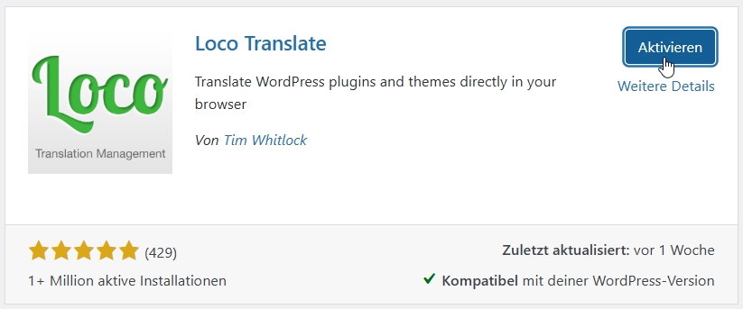 Wähle Loco Translate aus mit Jetzt installieren und klick anschliessend Aktivieren: