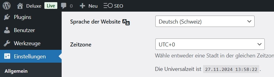 Alle Einstellungsmöglichkeiten sind in Englisch. Vielleicht macht dir das nichts aus, aber was wenn du ein Plugin nutzt, z.B. für eine Terminverwaltung (haben wir ebenfalls in diesem Jahr besprochen), wo du Textstrings wirklich in Deutsch (Schweiz) brauchst, weil dort sich eben dein Zielpublikum befindet?